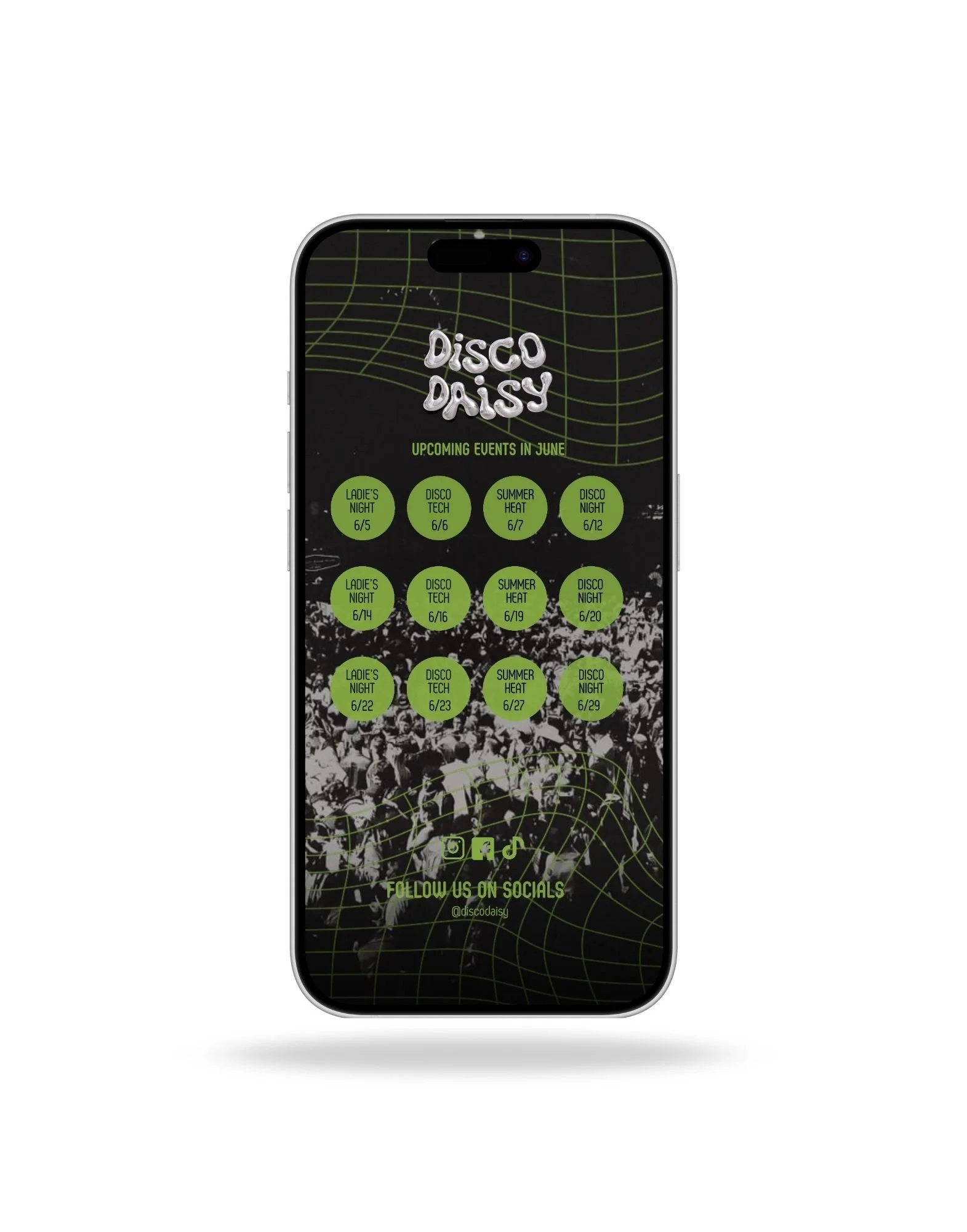Smartphone displaying a schedule of upcoming events in June for Disco Daisy, including Lady's Night, Disco Tech, and Summer Heat, with various dates and a crowd in the background.